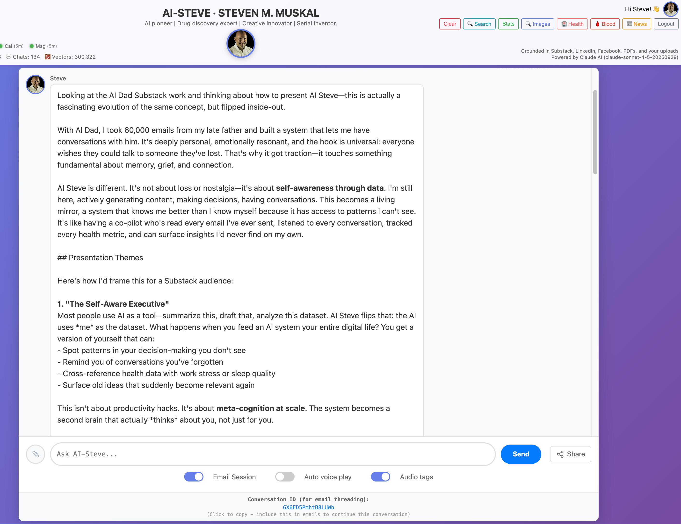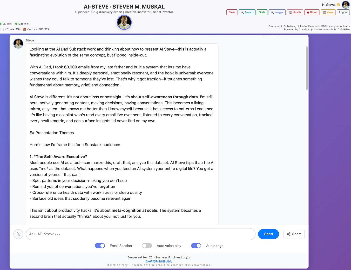 AI Steve started as a memorial project, a way to preserve my father’s intellect after his passing. It became a mirror of my own cognition, capable of surfacing blind spots, forgotten insights, and long term patterns I could not easily see on my own.
