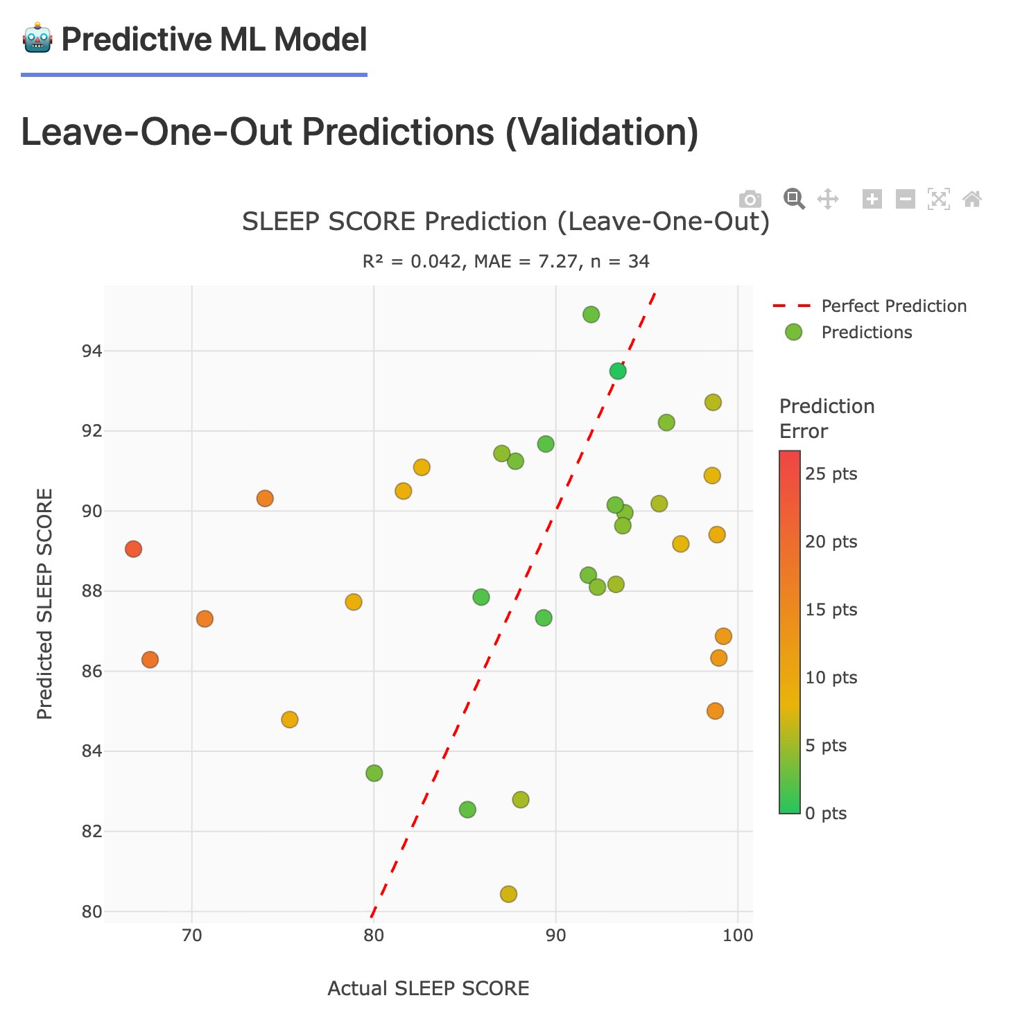 The leave-one-out validation plot is the first pass at answering the only question that really matters at this stage: does the model extrapolate? Here, performance drops sharply, with R² = 0.042 and MAE = 7.27, which is a clear signal that the current feature set, sample size, or both are not yet sufficient for reliable day-to-day prediction.