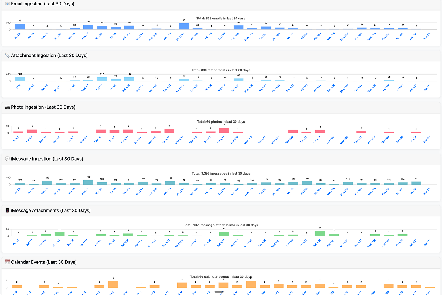A file watcher polls every 60 seconds and monitors email, iMessage, calendar, photos, and health exports.