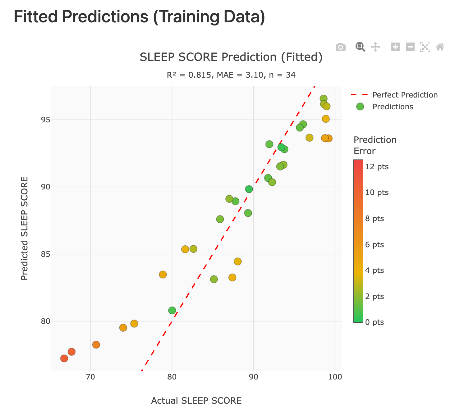 In the fitted training plot, the model tracks the observed sleep score closely, with R² = 0.815 and MAE = 3.10. That looks encouraging, but it is also exactly where overfitting can hide: the model can appear strong simply because it has effectively memorized the patterns present in the examples it has already seen.