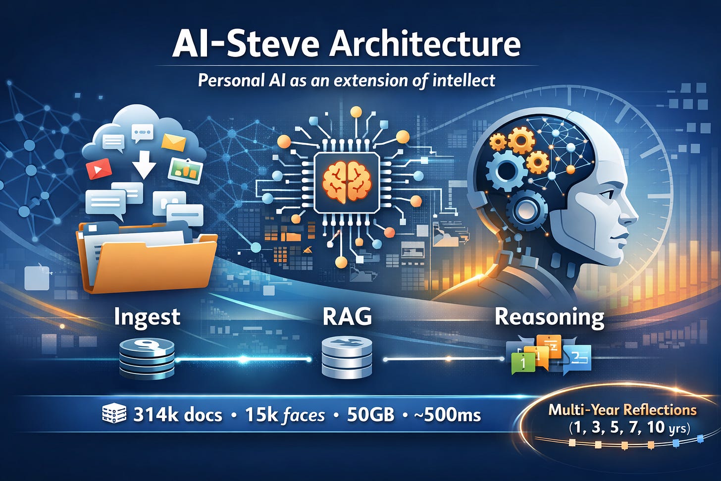 What started as a memorial project evolved into something far more ambitious: AI Steve, a comprehensive personal AI assistant that does not simply answer questions. It amplifies my reasoning patterns, surfaces forgotten context, and increasingly behaves like an extension of how I think.