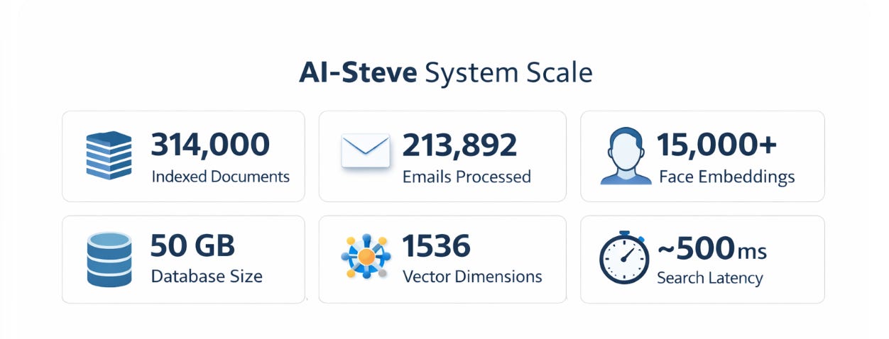 AI Steve is built on PostgreSQL with the pgvector extension. It uses OpenAI embeddings (text embedding 3 small) and Anthropic Claude Sonnet 4.5 for generation. The system processes more than 314,000 documents across 15 content types, with approximately 500 ms search latency and full temporal awareness.