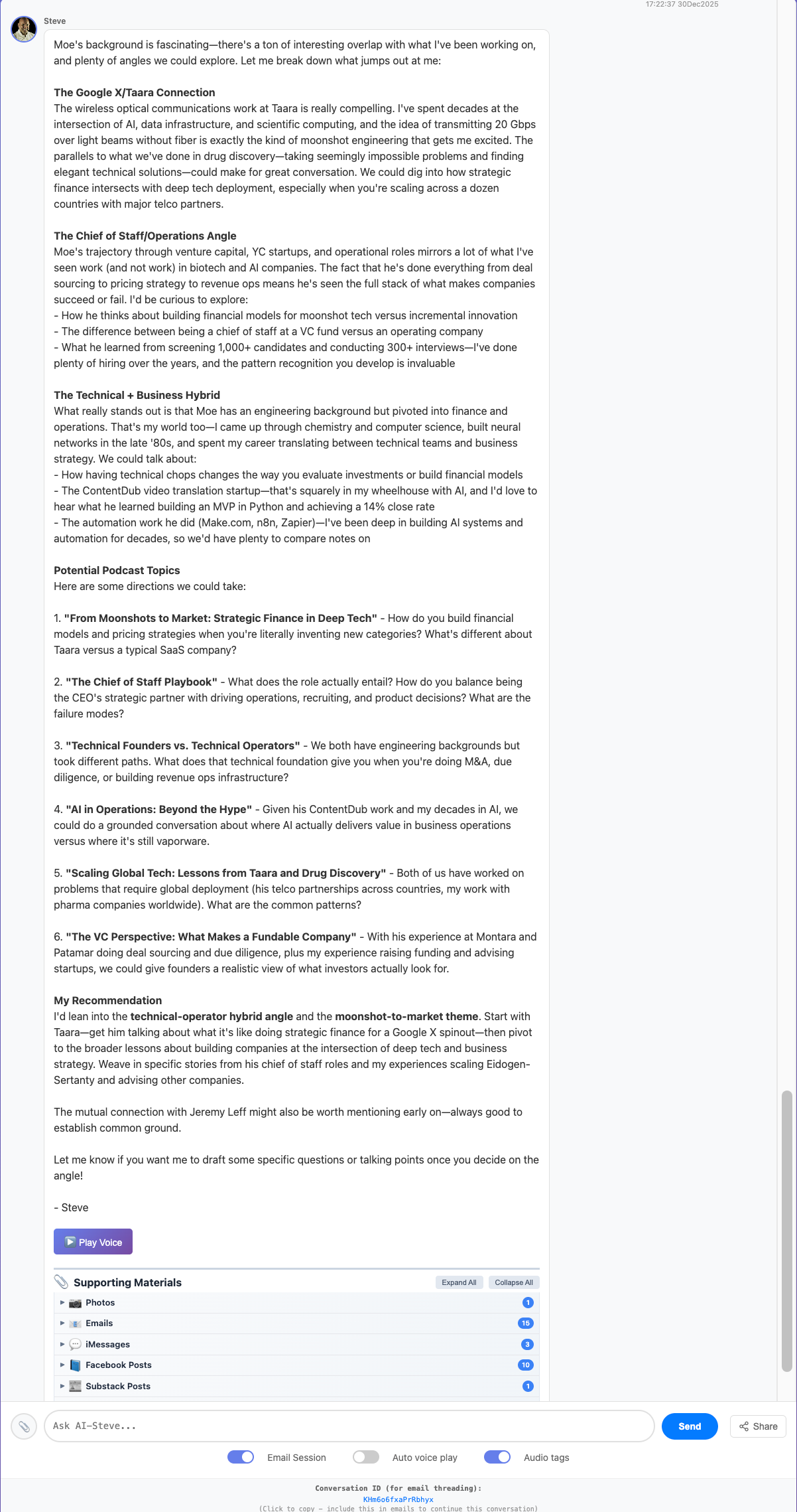 This is the AI/Steve response when prompted what to talk about. We touched on some of these things: