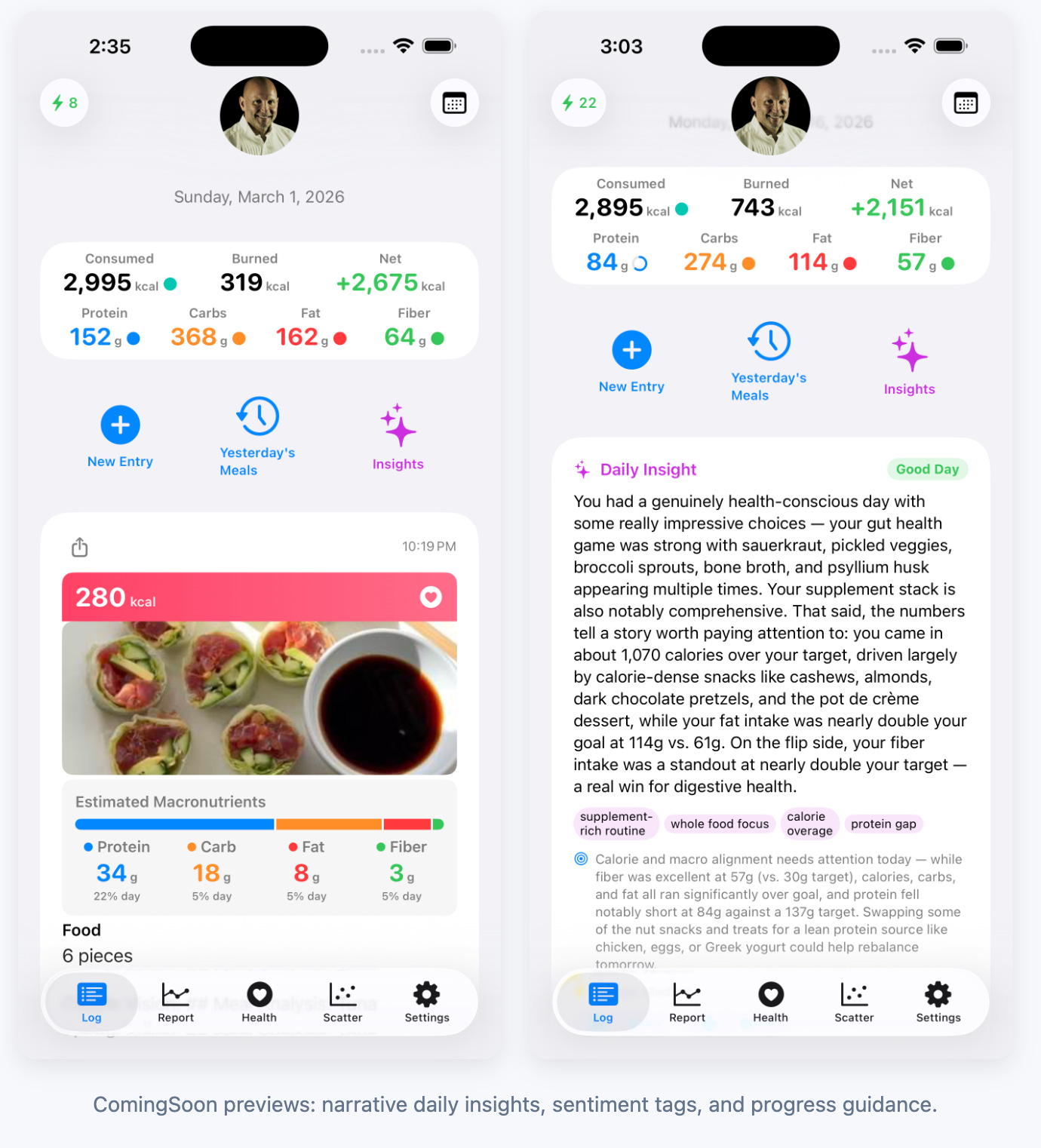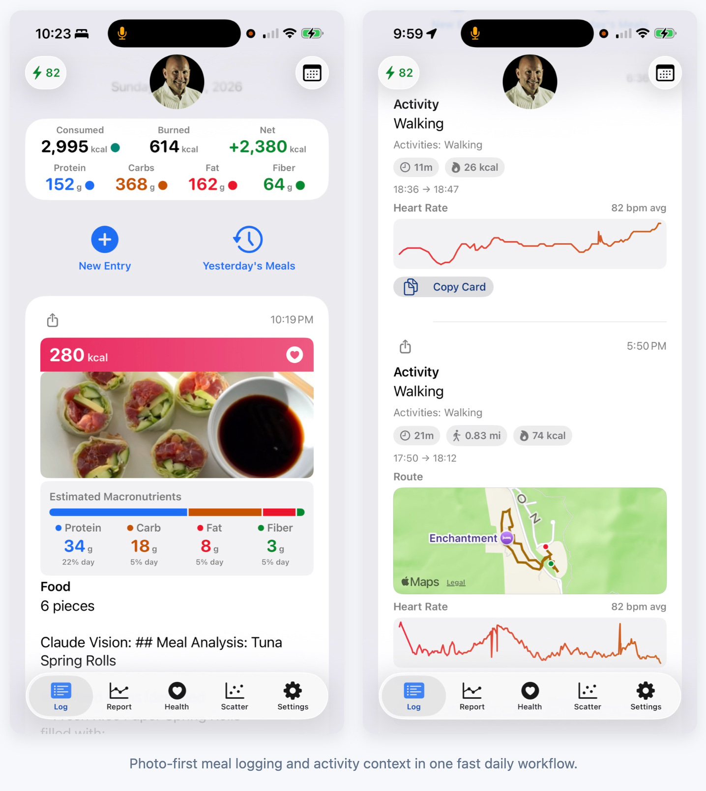 The app integrates with Apple Health so that activity metrics, calorie burn, and sleep data can be viewed alongside nutrition information. Seeing these signals together often reveals relationships that might otherwise go unnoticed.