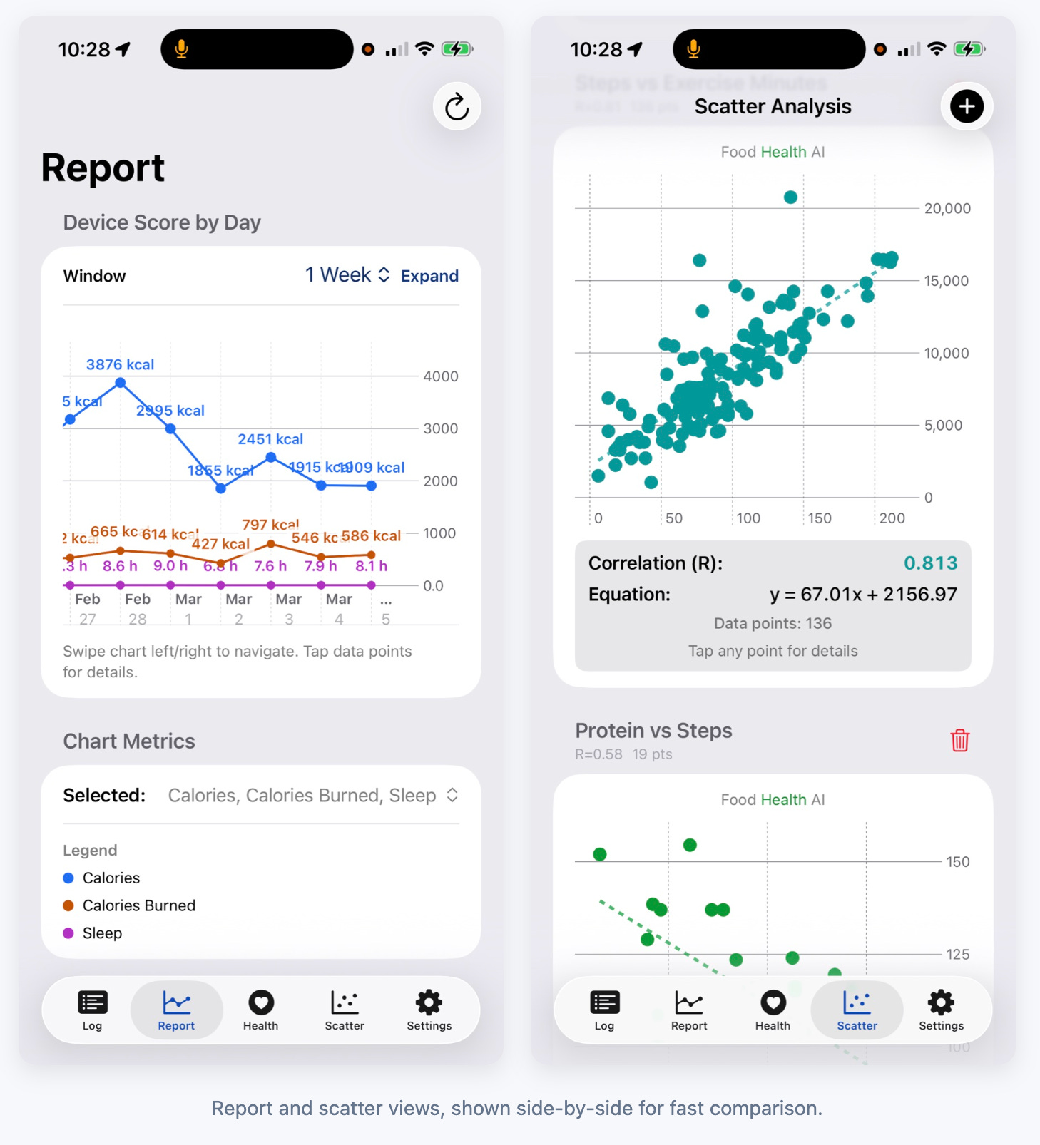 For example, a user might notice that certain eating patterns correlate with deeper sleep, or that changes in macronutrient balance influence recovery after exercise. The scatter analysis feature in the app allows users to explore these pairwise relationships and examine how strongly two variables appear to move together.