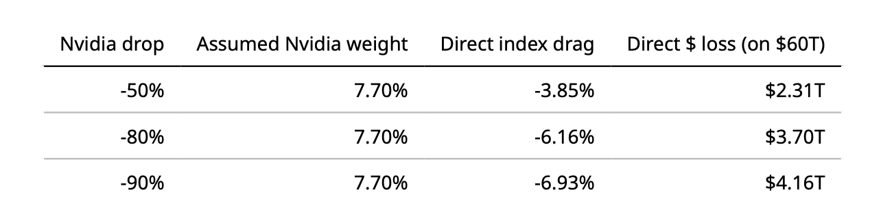 A 50 percent Nvidia decline implies roughly a 3 to 4 percent S&P drag.